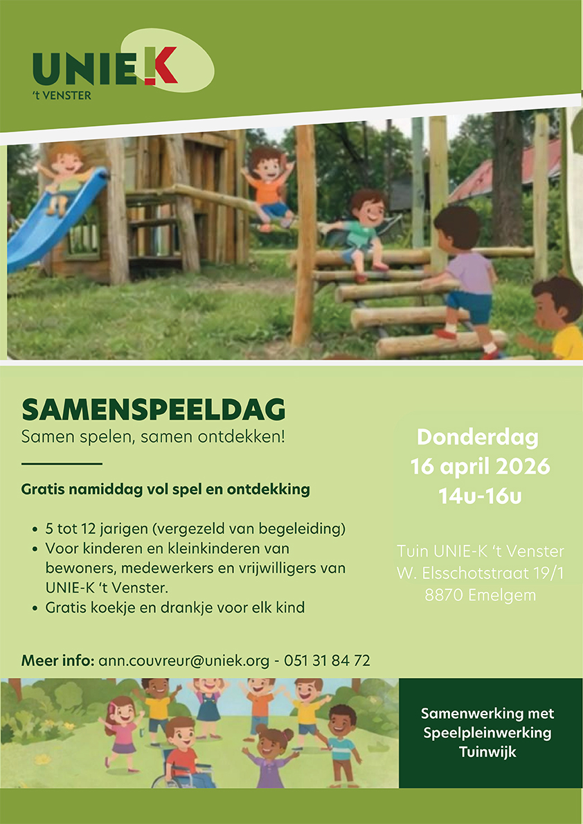 Je bent van harte uitgenodigd op de buitenspeelnamiddag in UNIE-K ’t Venster. We maken er een gezellige en speelse namiddag van waar je samen met je (klein)kinderen kan genieten van leuke activiteiten, beweging en ontmoeting.